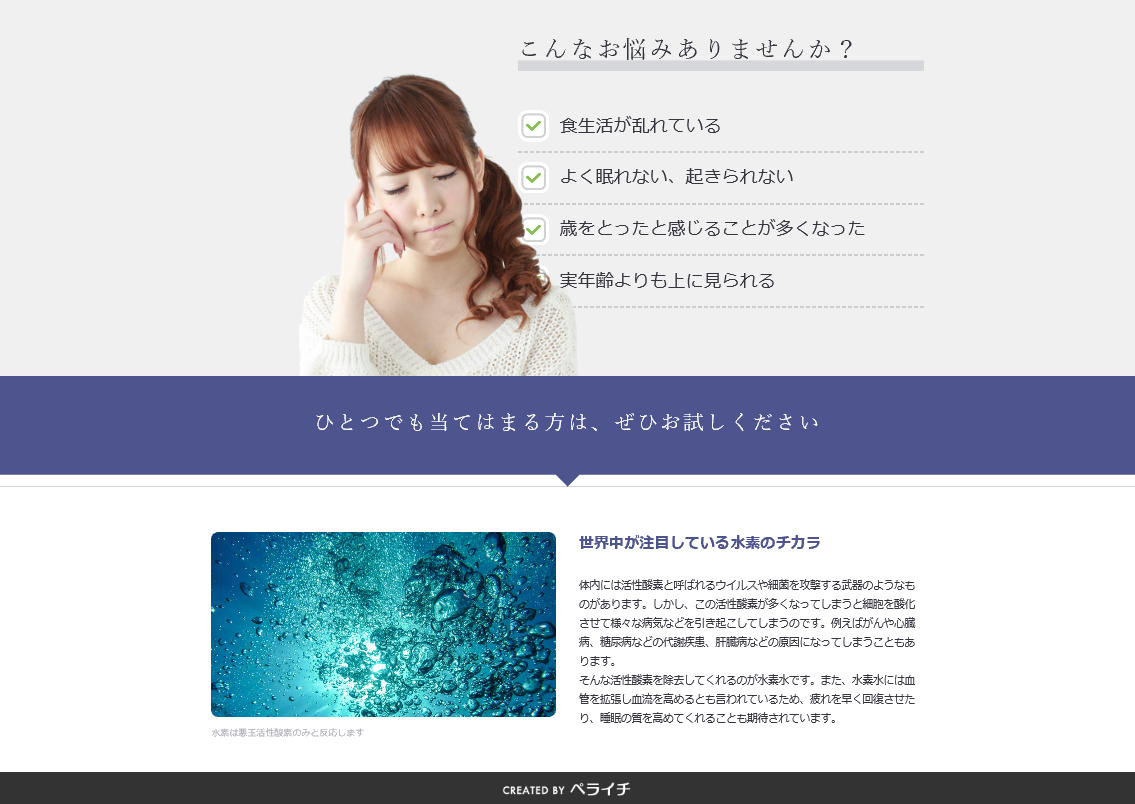ユーザーがベネフィットを見て商品を購入したくなってきたところで、商品の詳細を記載します。