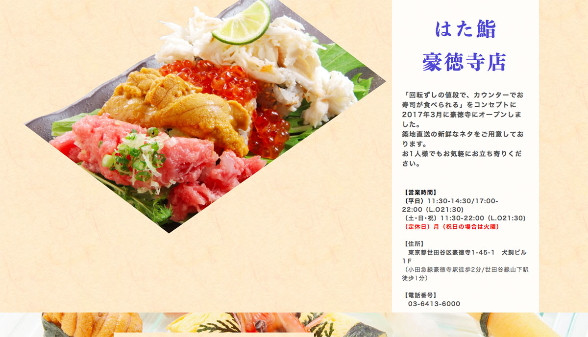 こちらは、「回転ずしの値段で、カウンターでお寿司が食べられる」をコンセプトに2017年3月に豪徳寺にオープンした「はた鮨 豪徳寺店」様のホームページです。